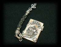 | 今月は撮影が一切無いと思われたが、8月最後の日も結局撮影と相成りまして考えてみれば去年の8月からなんかしらの撮影である俺。そんな事ばかりやってねーで、さっさと新作出せとかオーダーした商品作れとか言われそう。いや、既に言われてるけど常にゴーイング・マイ・ウェイな俺。しかし、この日は違った!!俺の中で映画「タイタニック」で女優ケイト・ウィンスレットの乳が汚かったのを見た時以上の衝撃が走り、アインシュタインの「相対性理論」とフロイトの唱える「超自我」を足して2で割らなくても解明出来ない程の気合いでかねてより作りかけていた新作を完成させた俺!!しかし、これを身に着ける程の器を持つ奴はそうざらにいないであろう。それもそなはず、完成したのはアクセサリーでは無かった!売り物にする気もさらさら無いので写真でも撮っておこっと。これも「ストリートアクセNEXT FILE4」で公開。実物見たい人は9/22からの展示会「WORK SHOP N.Y」にて展示致します。ただし、NEW YORKまでは自費で来れるならばね。 |